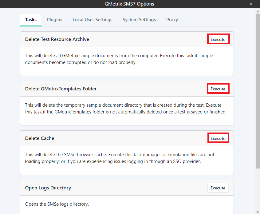 - Delete Cache (this will close and reopen GMetrix)